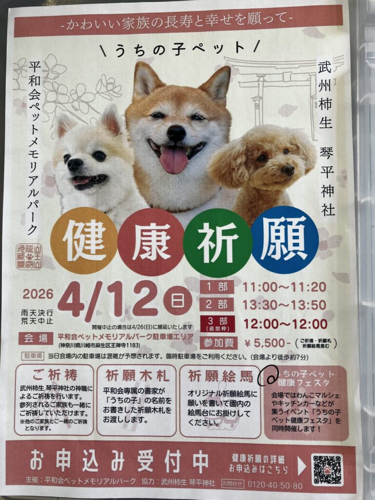 いつもお世話になっている平和会ペットメモリアルパークさん主催でペットの健康祈願会がおこなわれます。ペットと一緒に健康をご祈祷出来るそうです。